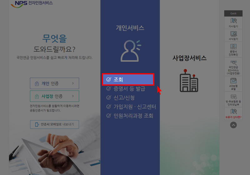 인증을 완료한 뒤 같은 화면에서 개인서비스 부분에 마우스를 이동합니다. 그럼 보이지 않던 메뉴가 보이는데 그중 가장 첫 번째에 보이는 조회 메뉴를 클릭합니다.