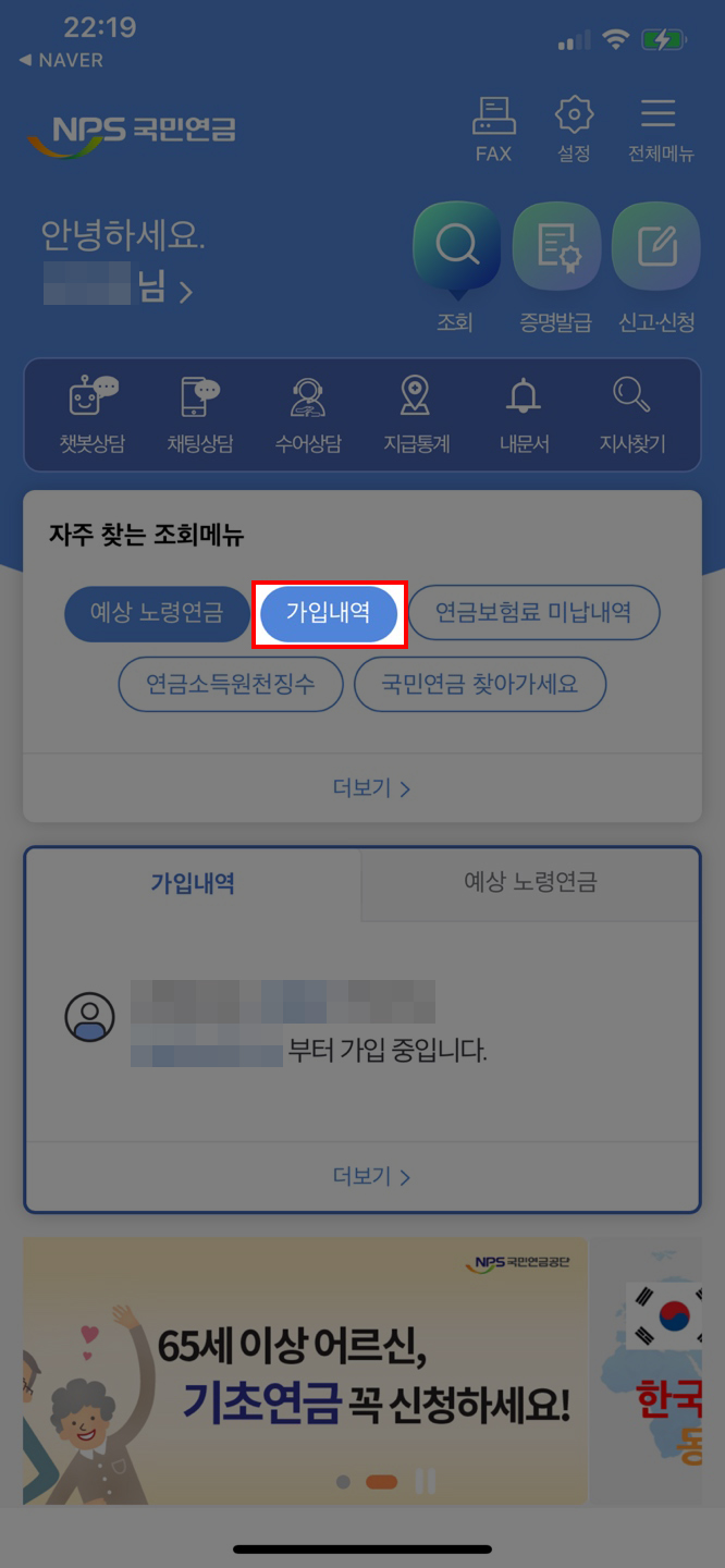홈페이지에서와 마찬가지로 본인의 국민연금 가입정보를 확인할 수 있습니다.