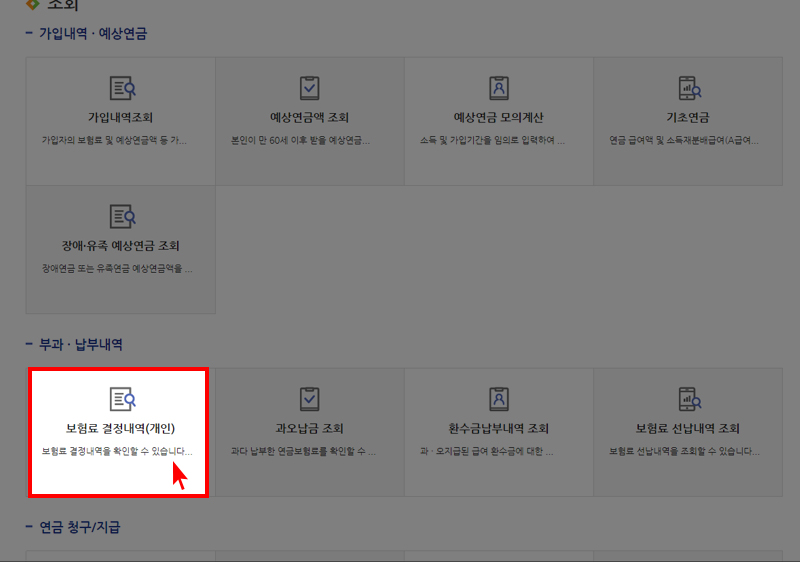 직장 가입자라면 가입내역 조회를 지역 가입자라면 보험료 결정내역을 클릭합니다.