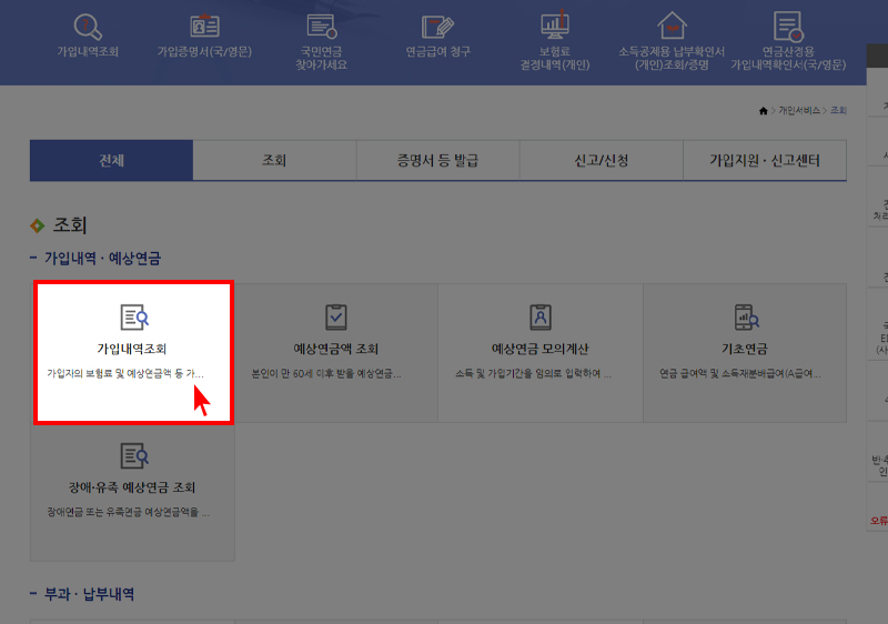 조회 메뉴에서는 본인이 가입한 국민연금과 관련된 다양한 내역을 확인할 수 있습니다. 가입내역 조회도 이곳에서 할 수 있습니다. 가입내역 외에도 국민연금 예상수령액을 확인할 수도 있으니 필요하다면 이용해 보시기 바랍니다.