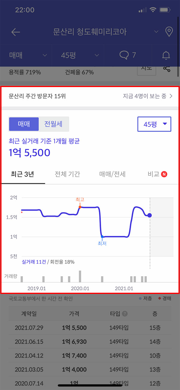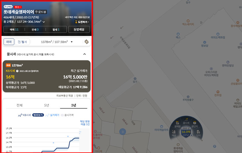 실거래가가 궁금한 아파트를 선택하면 시세정보를 포함한 다양한 정보를 바로 확인하실 수 있습니다. 개인적으로 PC와 모바일에서의 사용법이 거의 동일해서 매우 쉽다는 점이 좋았습니다.