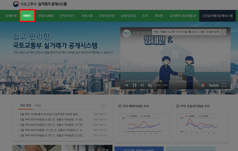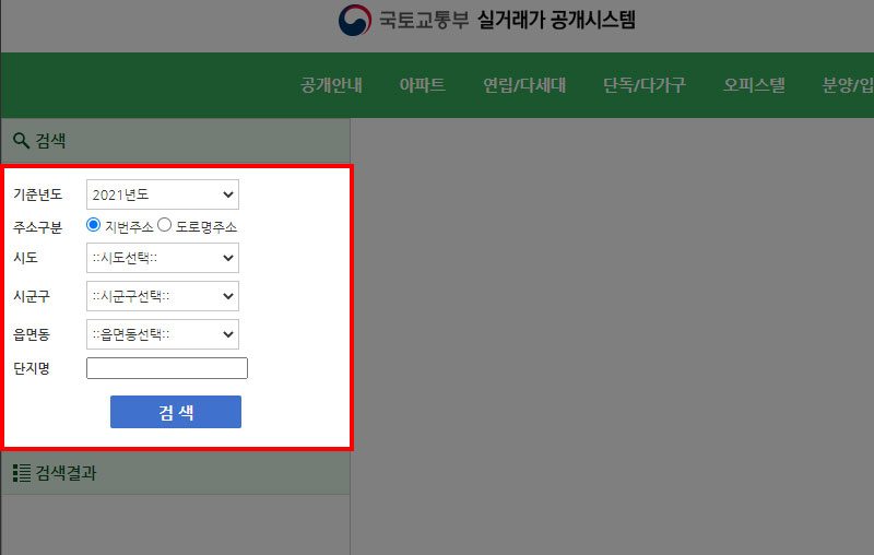 포털사이트에서 '국토교통부 실거래가'라고 검색하신 뒤 홈페이지에 접속합니다. 메뉴에서 아파트를 선택한 뒤 원하는 검색 조건을 입력하면 거래 금액을 확인할 수 있습니다.