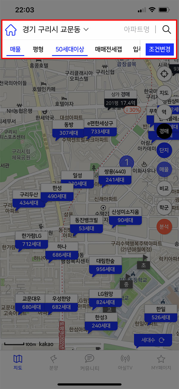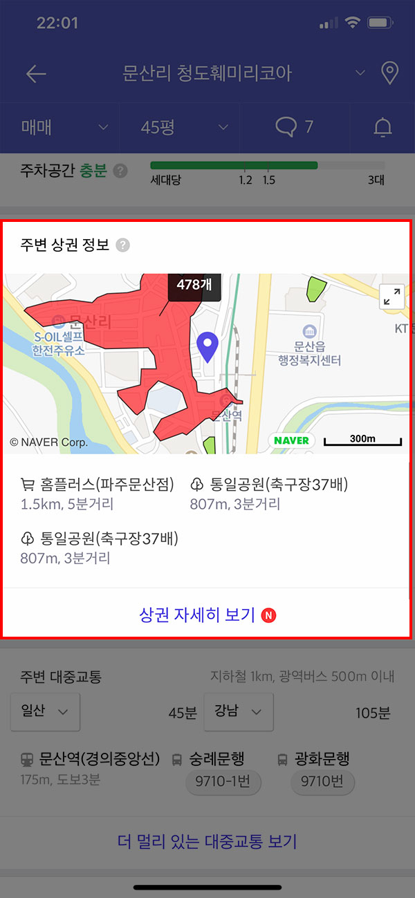 거래가 외에도 해당 아파트 주변의 상권 정보를 제공하고 있다는 점이 장점입니다. 거주를 할 생활공간이 가장 중요하겠지만 주변의 인프라가 잘 갖춰져 있지 않다면 매우 불편하기 때문에 꼭 살펴봐야 할 정보 중 하나입니다. 앱에서 제공되는 정보를 통해 직접 찾아가 보지 않아도 간단한 주변 환경은 확인할 수 있다는 점이 장점인 것 같습니다.