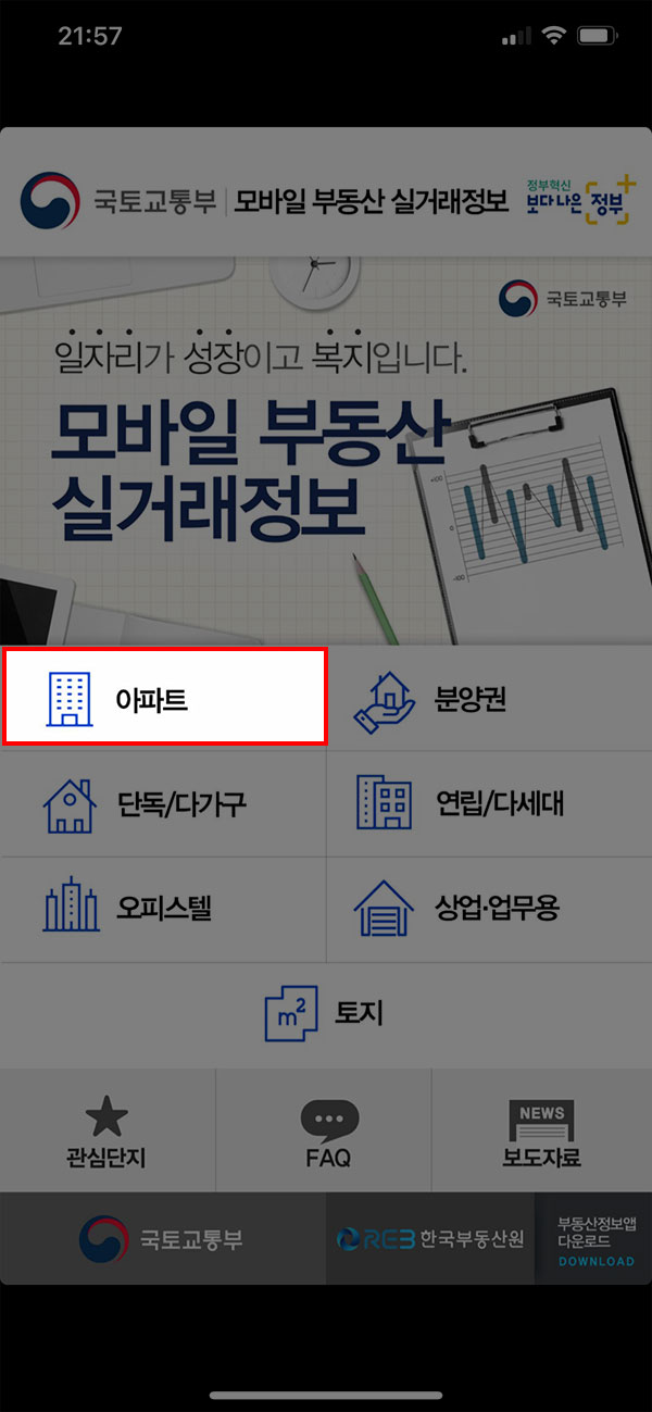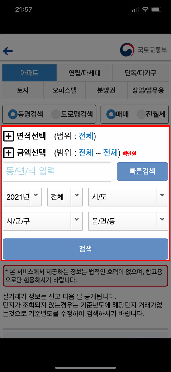 국토교통부 모바일 부동산 실거래 정보 앱을 설치한 뒤 실행해주세요. 첫 화면에서 아파트를 선택한 뒤 원하는 지역과 조건을 입력하고 검색 버튼을 누르면 바로 매매 가격 내역을 확인할 수 있습니다.