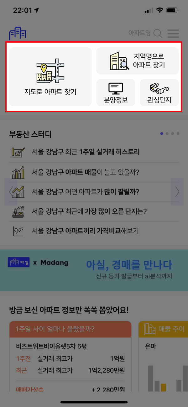 앱을 실행한 뒤 첫 화면에서 원하는 검색 방식을 선택해주세요. 저는 지도로 아파트 찾기를 선택해 보았습니다. 다음 화면에서 상단에 검색 조건을 입력한 뒤 원하는 아파트 또는 단지를 선택하면 바로 거래정보를 볼 수 있습니다.