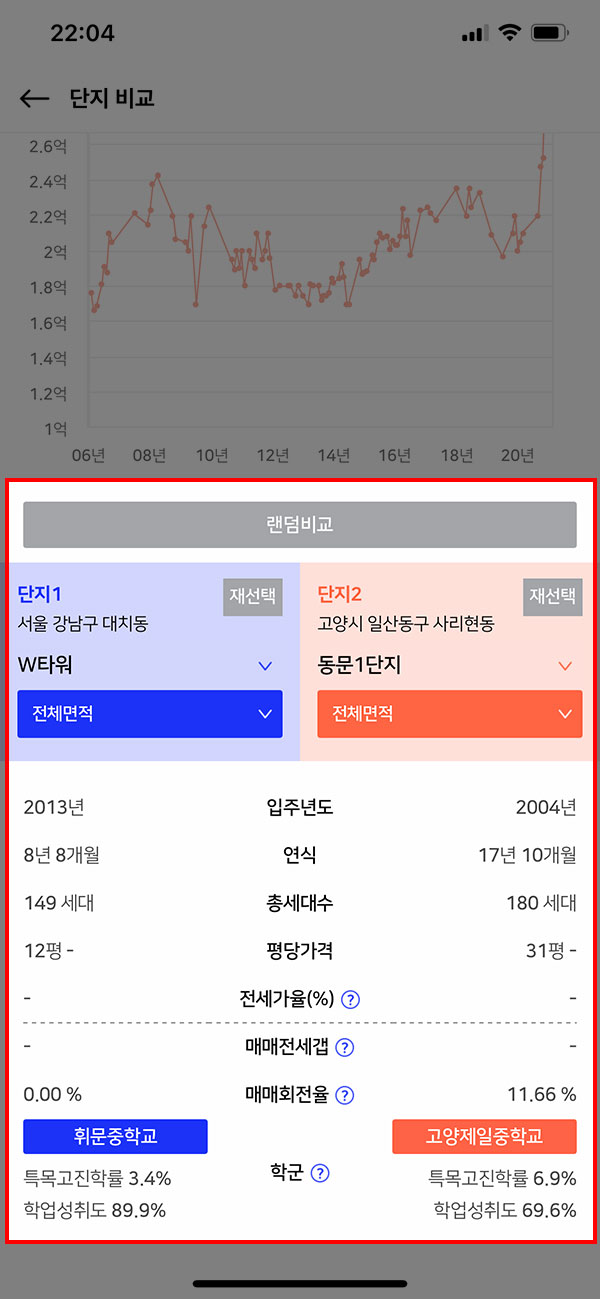 하지만 실거주자가 작성한 글을 통해 일부 정보를 확인할 수 있다는 것은 매우 큰 장점으로 느껴집니다. 그리고 또 다른 기능은 단지 비교 기능으로 두 지역의 아파트 단지를 선택하면 한번에 정보를 볼 수 있습니다.