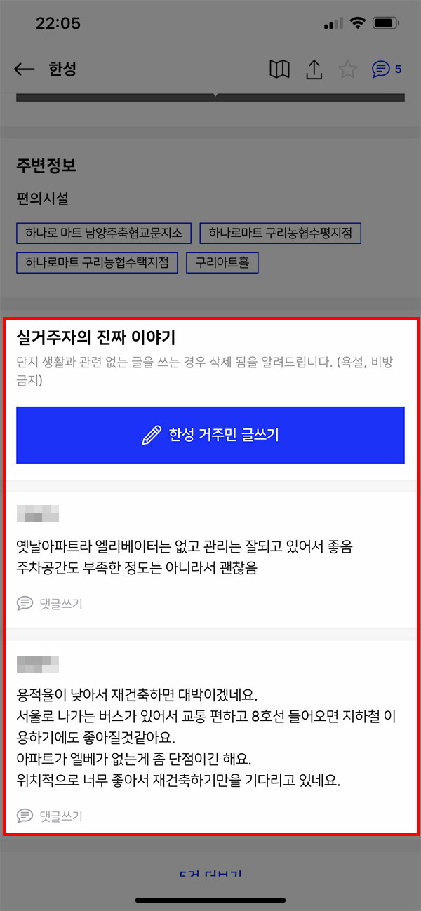 여기까지는 다른 조회 서비스와 별 차이가 없는 것처럼 보이지만 다른 점이 있습니다. 바로 실거주자의 이야기를 확인할 수 있다는 점인데요. 아파트 주변은 볼 수 있지만 내부를 확인하기 어려운 것이 사실입니다.