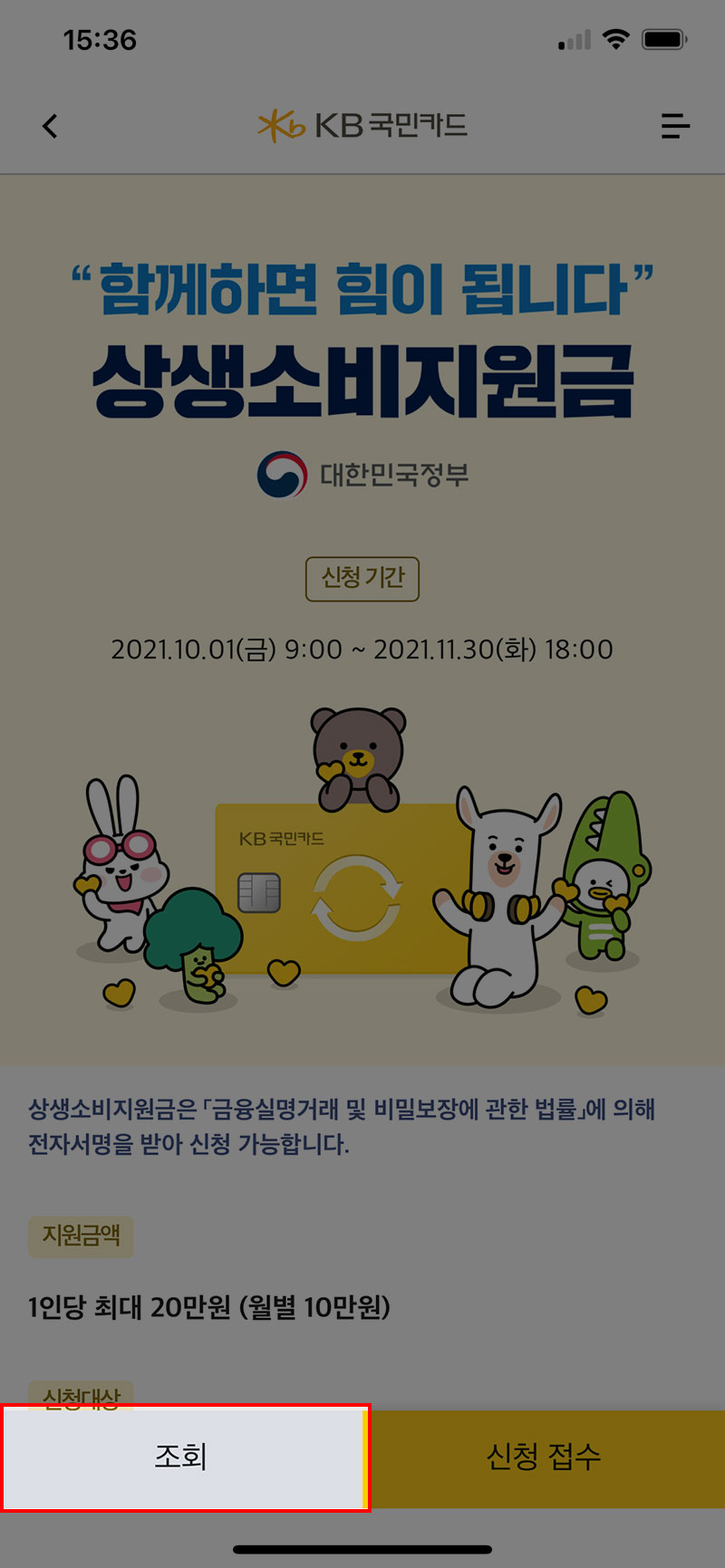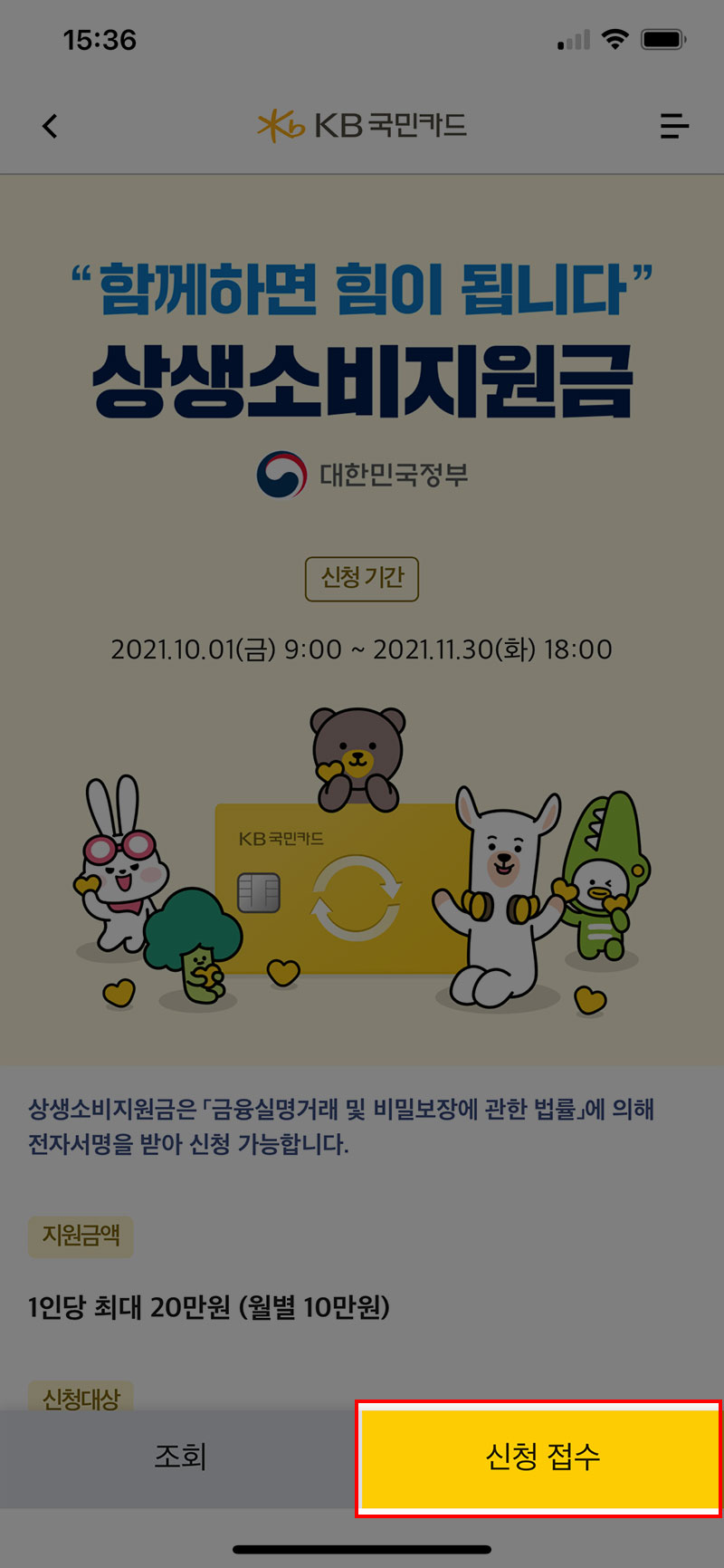 아쉽게도 많은 분들이 이용하시는 카카오뱅크는 상생지원금 신청이 불가능합니다. 이럴 경우 신청이 가능한 카드사의 카드를 신규로 발급받아 신청하시면 됩니다.
