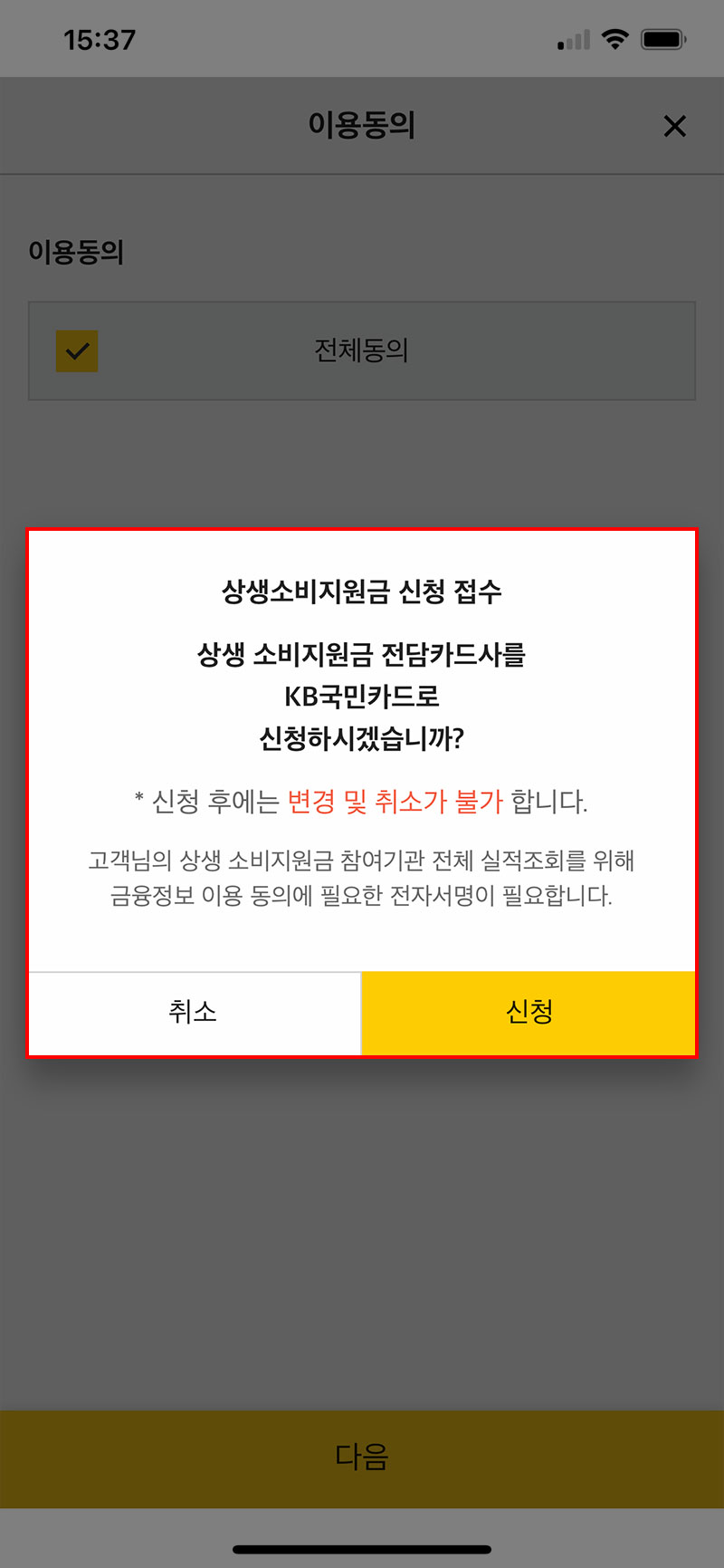 유의사항 확인과 개인정보 이용 동의를 마치면 전담 카드사로 신청할 것인지 한 번 더 확인하는 단계를 거칩니다. 한번 신청한 뒤에는 변경이 불가하므로 유의해주세요.