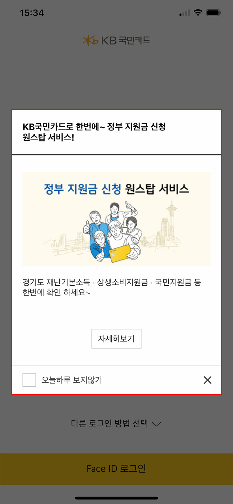 국민카드 앱을 실행하면 첫 화면에 정부 지원금과 관련된 모든 신청을 한 곳에 모아둔 안내문구를 확인할 수 있습니다. 자세히 보기를 선택한 뒤 화면 중간쯤에 위치한 상생 소비 지원금 신청 안내를 선택하세요.