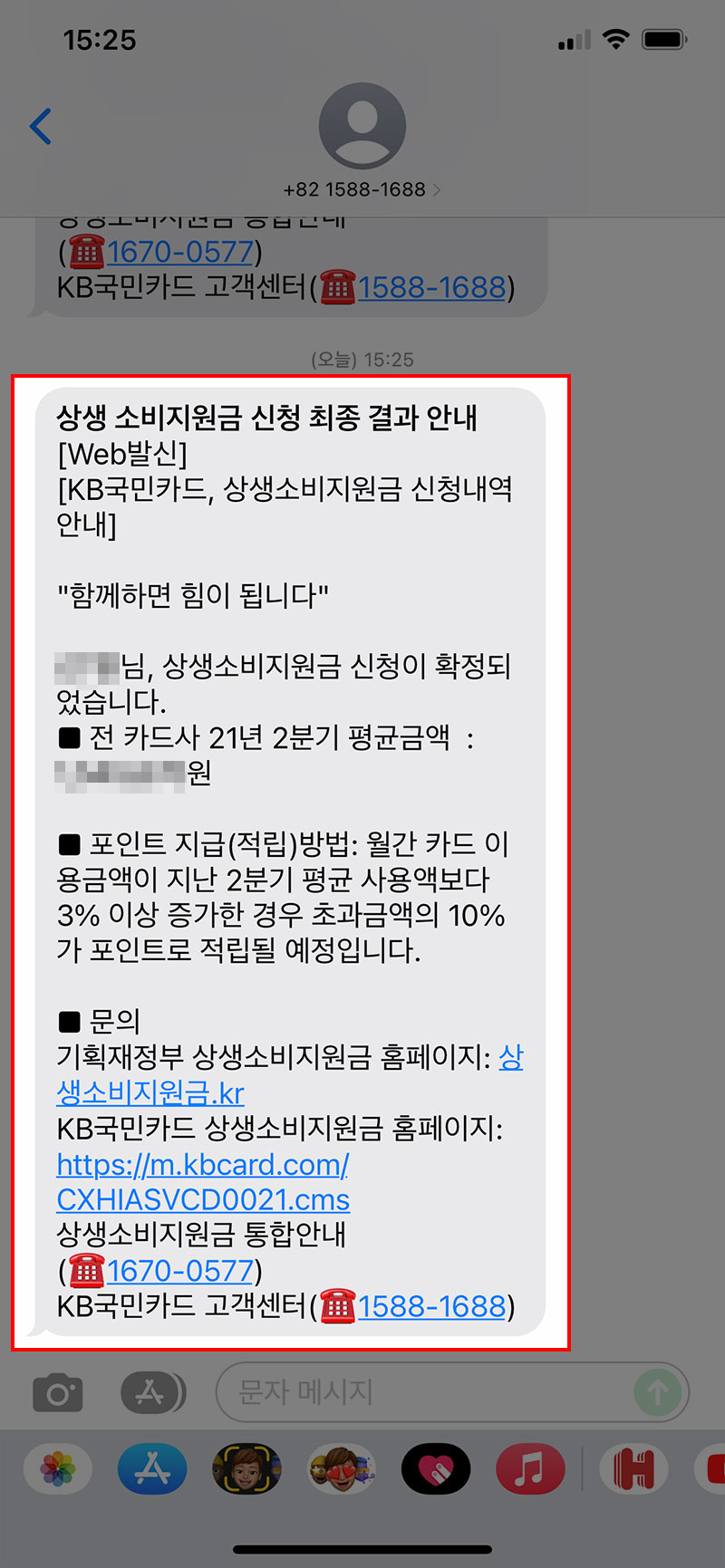 접수 완료 문자를 받은 뒤 1~2일이 지나면 신청 결과가 문자로 발송됩니다. 2분기 동안 사용한 모든 카드사의 금액이 반영된 평균 사용금액과 함께 포인트 지급 방법에 대한 안내를 확인할 수 있습니다. 이 문자까지 받으셨다면 이제는 적절하게 소비 금액을 관리하시면 됩니다.