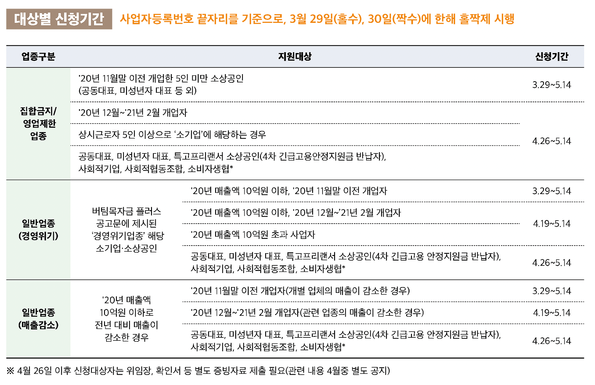 • 집합금지 지속 시설 : 체육시설, 노래방, 유흥업소 등 6주 이상 집합금지 조치가 지속된 사업체